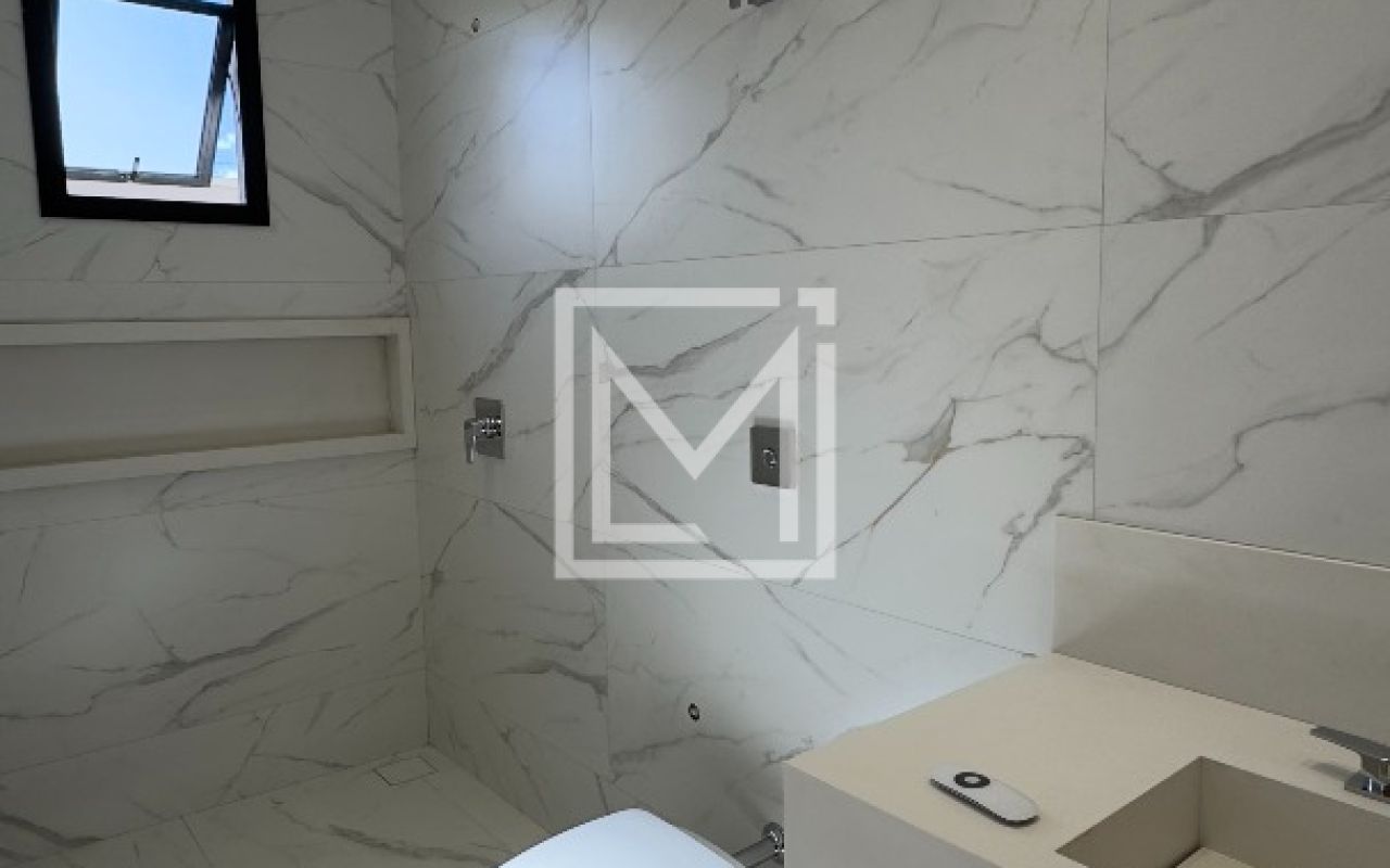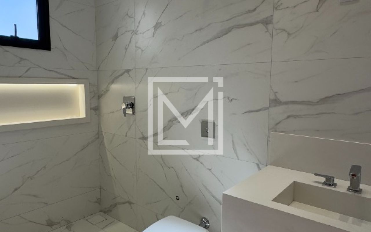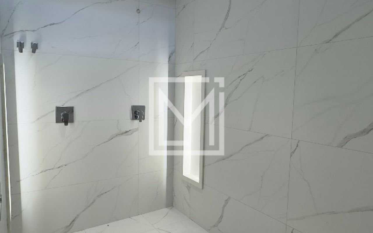Banheiro com porcelanato acabamento natural inspirado no mármore calacata. Metais Deca. Bancada com 2 cubas esculpidas em quartzo Branco e 2 nichos iluminados.