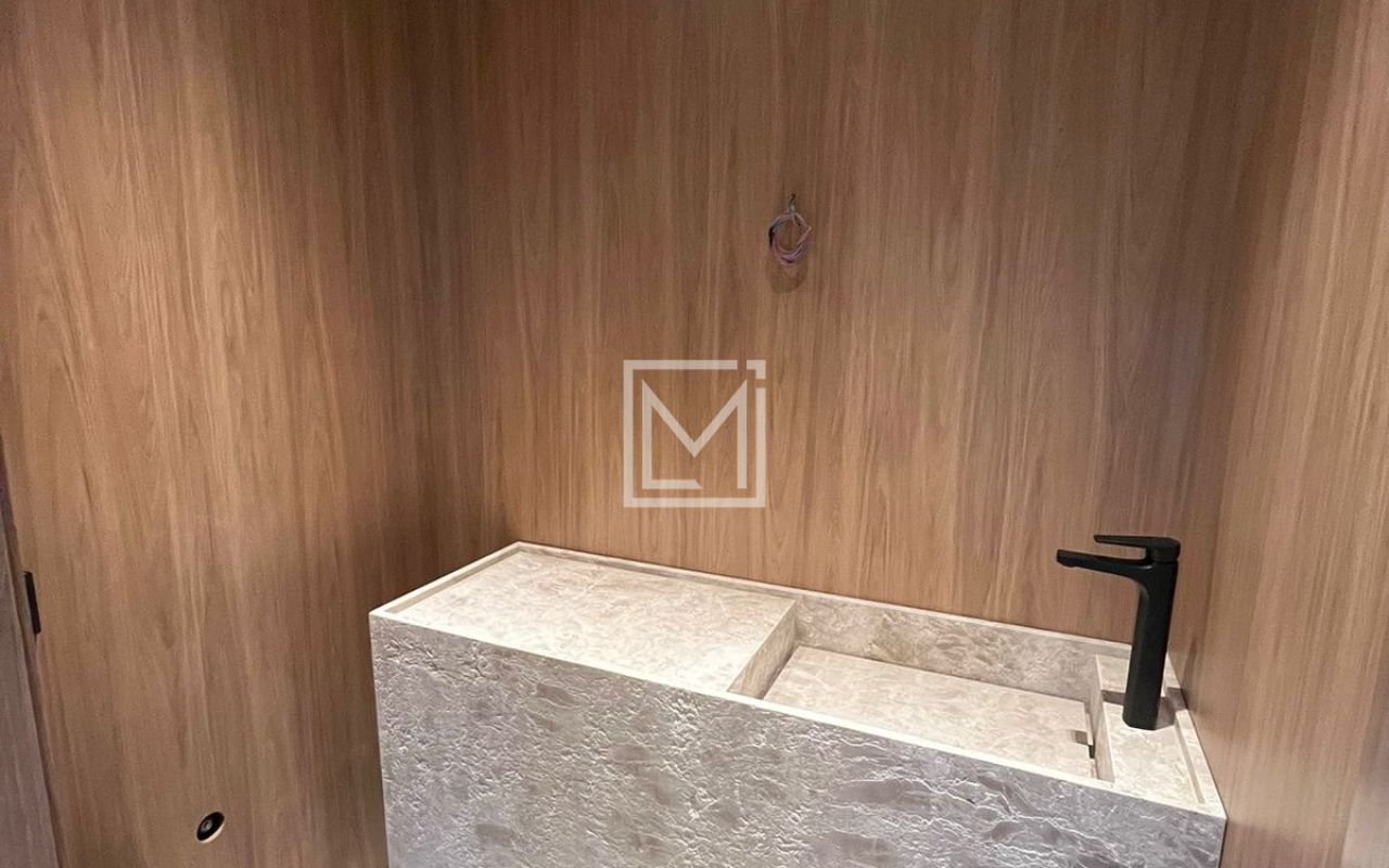 Lavabo interno extremamente sofisticado todo revestido em MDF e Cuba esculpida em mármore.